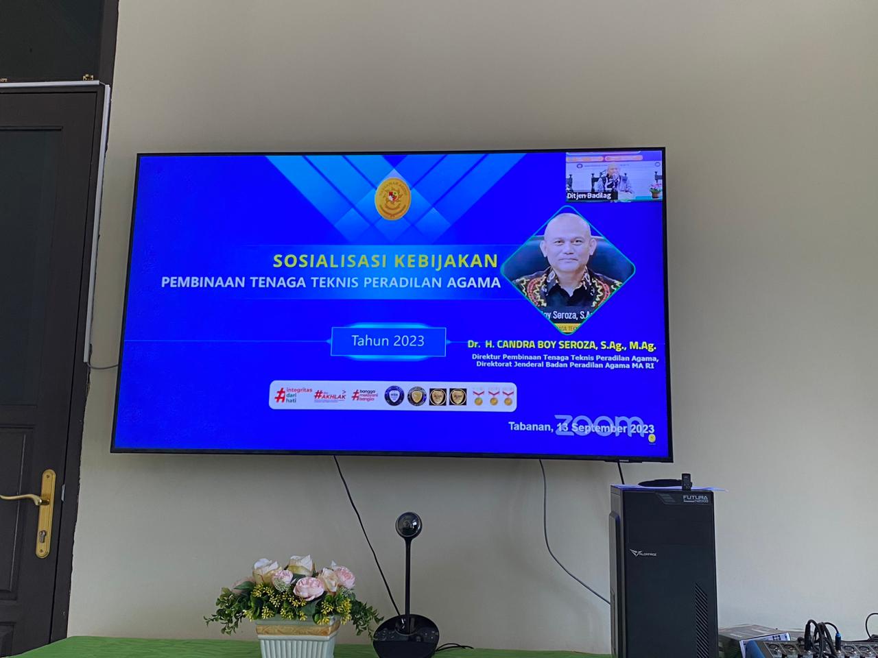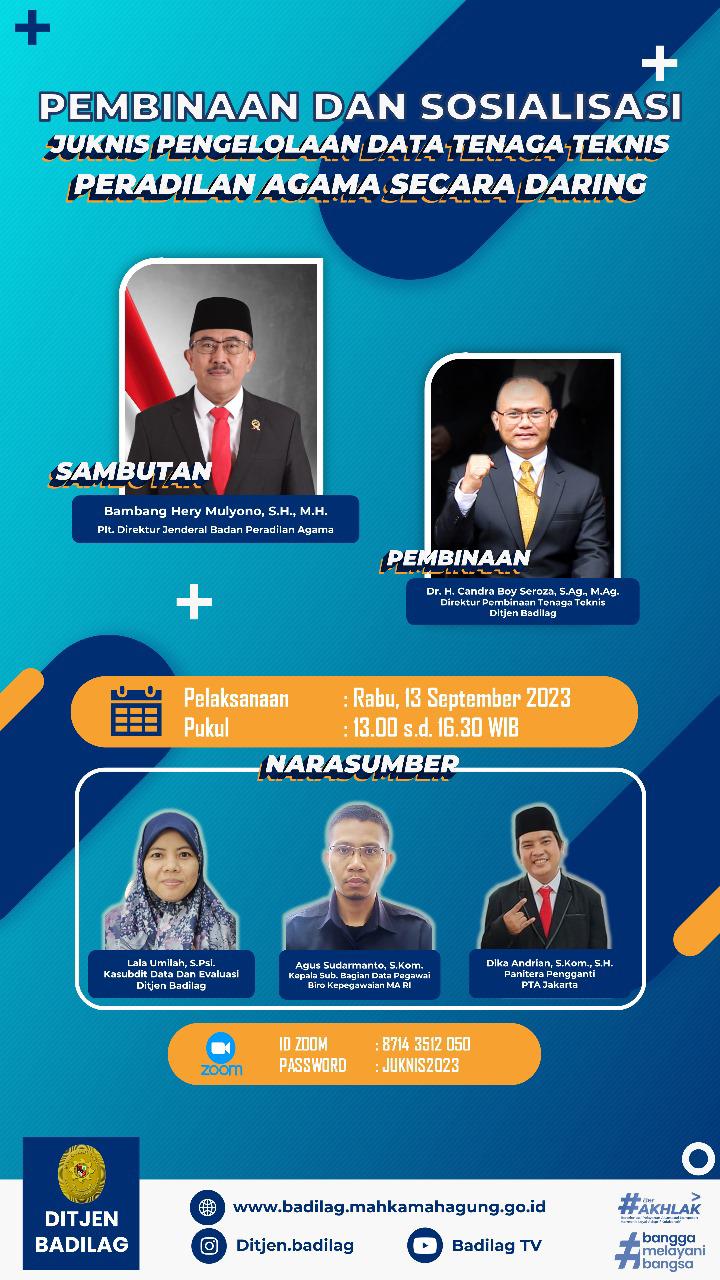Sesuai dengan Surat Nomor : 2811/DJA/HM.02.3/9/2023 tertanggal 8 September 2023 Direktorat Jenderal Badan Peradilan Agama menyelenggarakan Pembinaan dan Sosialisasi Juknis Pengelolaan Data Tenaga Teknis Peradilan Agama secara Online/Daring, yang dilaksanakan pada hari Rabu tanggal 13 September 2023, pukul 13.00 WIB sampai dengan selesai. Bertempat di Ruang Command Center/ Media Center masing-masing satuan kerja.