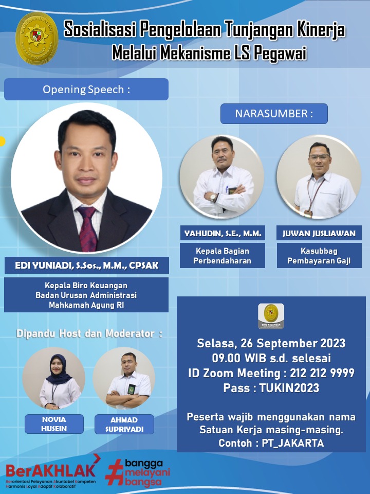 Sosialisasi ini dibuka secara resmi oleh Kepala Biro Keuangan Badan Urusan Mahkamah Agung, Edi Yuniadi, S.Sos, M.M. CPSAK. Adapun narasumber pada pendampingan ini adalah Yahudin, S.E, M.M. (Kepala Bagian Perbendaharan) dan Juwan Jusliawan Al-Fauz, S.E. (Kasubbag Pembayaran Gaji).