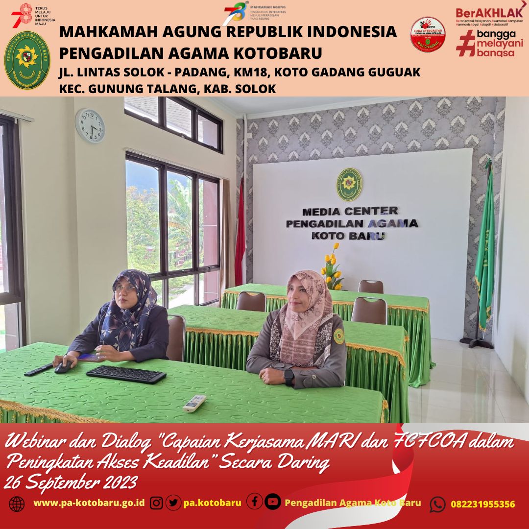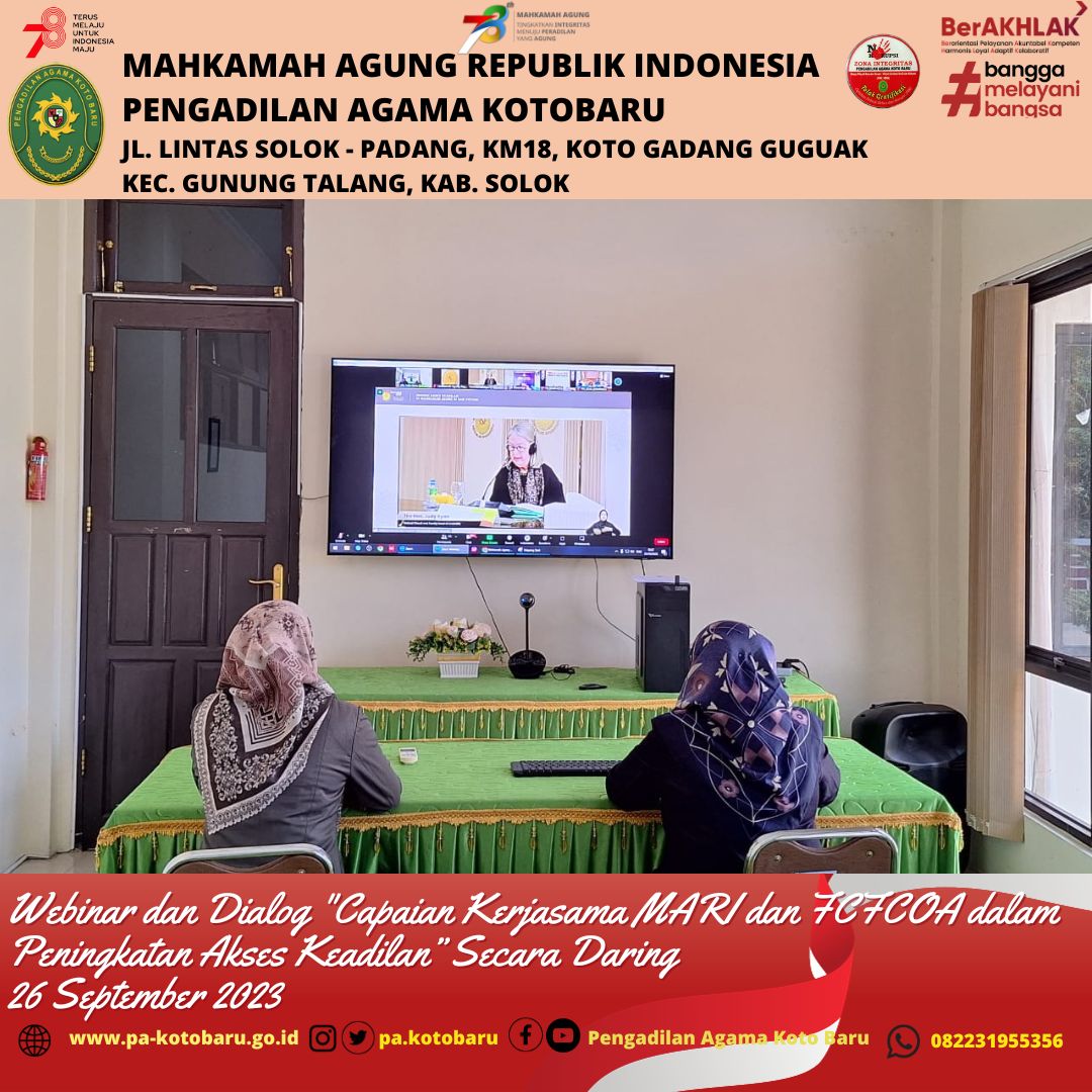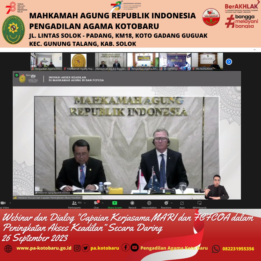 Koto Baru (26/9) –Mahkamah Agung Republik Indonesia bekerjasama dengan Family Court of Australia (FCoA) yang difasilitasi oleh Australia-Indonesia Partnership for Justice 2 (AIPJ2) menyelenggarakan Webinar dan dialog dengan topik "Capaian Kerjasama MARI dan FCFCOA dalam Peningkatan Akses Keadilan" pada Selasa, 26 September 2023 pukul 13.30-16.30 WIB melalui zoom meeting.