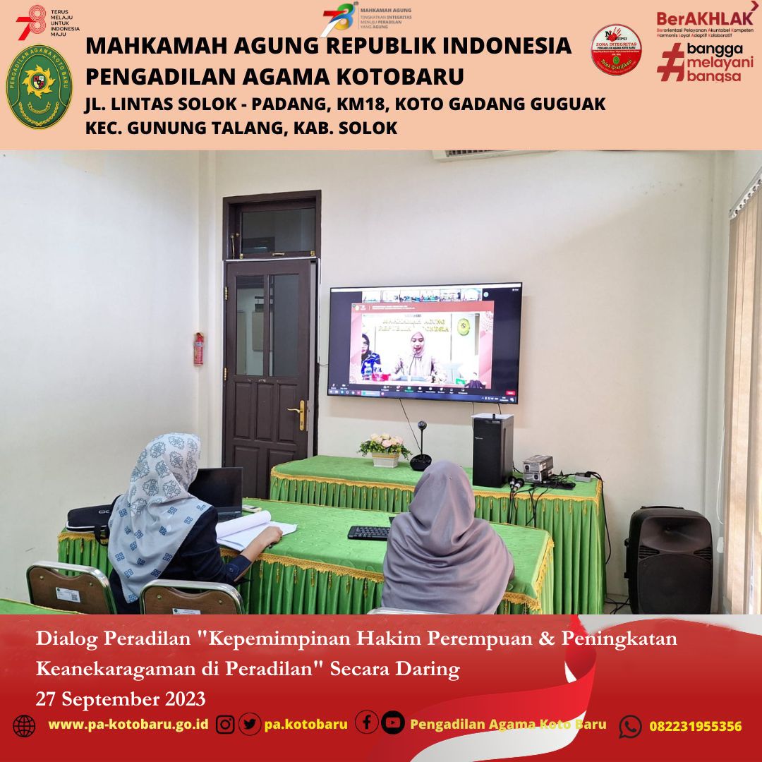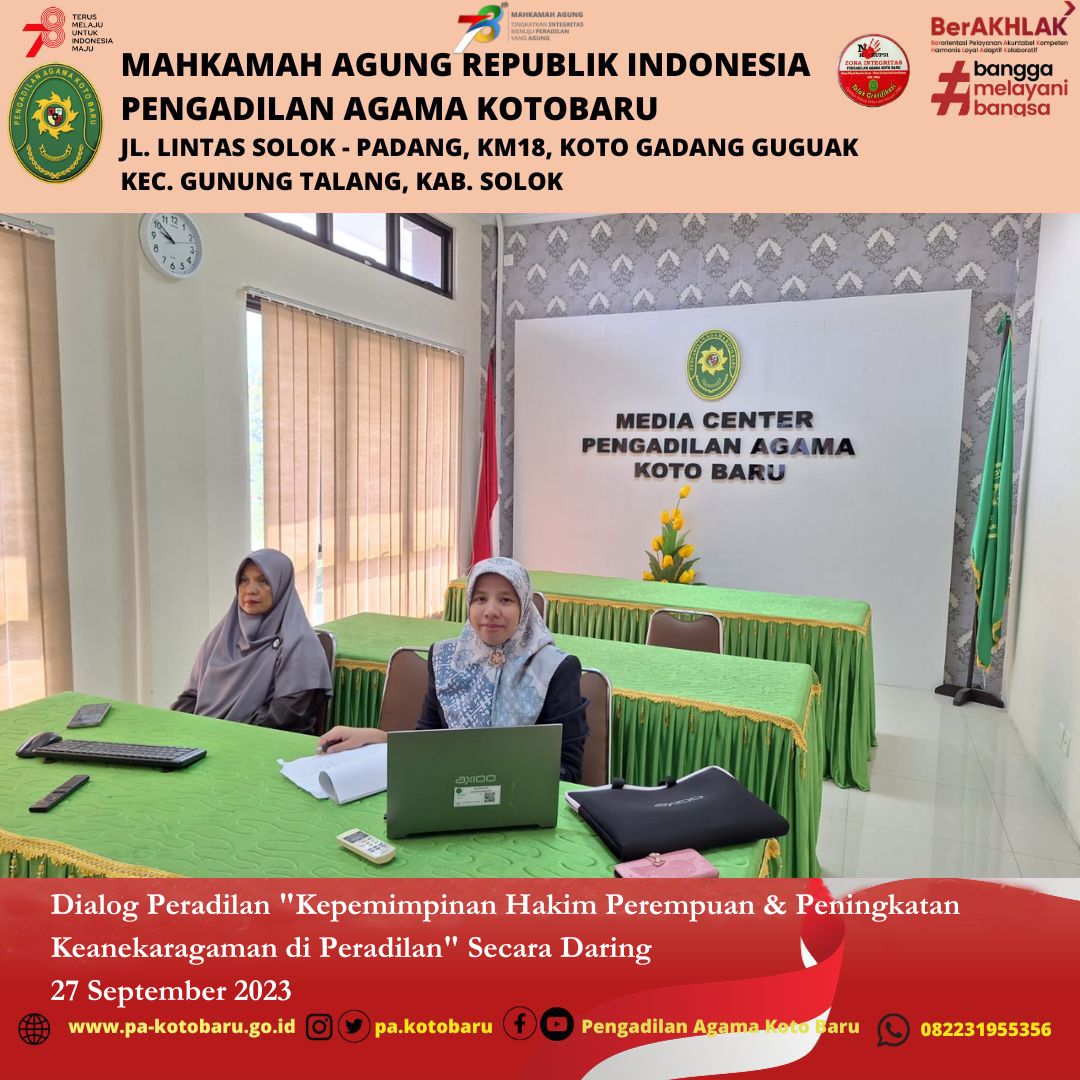Koto Baru (27/9) –Mahkamah Agung Republik Indonesia bekerjasama dengan Family Court of Australia (FCoA) yang difasilitasi oleh Australia-Indonesia Partnership for Justice 2 (AIPJ2) menyelenggarakan Webinar dan dialog dengan topik "Kepemimpinan Hakim Perempuan & Peningkatan Keanekaragaman di Peradilan" Secara Daring pada