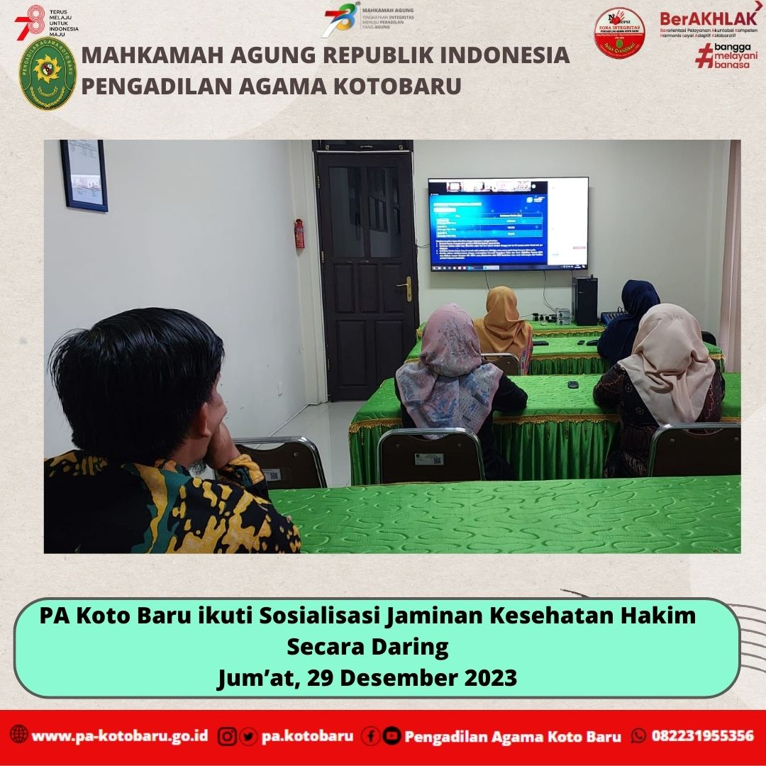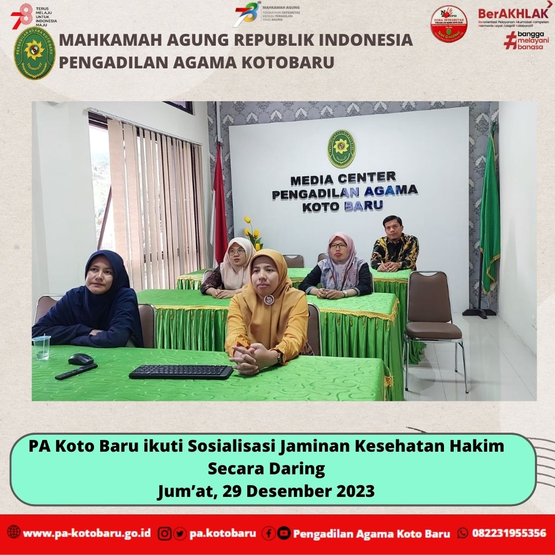 Jum’at (29 Desember 2023) Bertempat di Ruang Media Center Pengadilan Agama Koto Baru, Ketua Pengadilan Agama Koto Baru, Dr. Martina Lofa, S.HI, M.HI beserta Wakil Ketua dan Para Hakim Pengadilan Agama Koto Baru mengikuti sosialisasi jaminan kesehatan virtual bersama Mandiri Inhealth. Bapak Wawan Setiawan dari Mandiri Inhealth menjelaskan komitmen Mandiri Inhealth dalam memberikan layanan asuransi terbaik bagi hakim Mahkamah Agung RI. Layanan tersebut, diberikan kepada hakim aktif Mahkamah Agung RI yang berusia maksimal 67 tahun. Pemberian jaminan kesehatan ini merupakan komitmen Mahkamah Agung RU dalam mendukung kinerja hakim dalam memberikan pelayanan peradilan kepada masyarakat