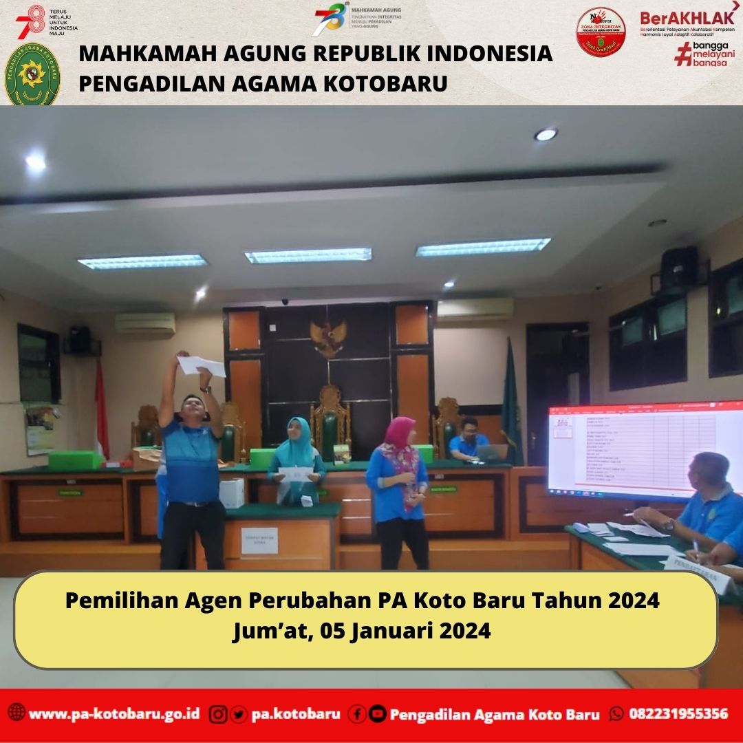 Bertempat di Ruang Sidang Pengadilan Agama Koto Baru, Aparatur PA Koto Baru laksanakan Pemilihan Agen Perubahan tahun 2024 yang dihadiri Ketua, Wakil Ketua, Hakim, Panitera, Sekretaris, Pejabat Fungsional, Pejabat Struktural, Karayawan/Karyawati serta PPNPN Pengadilan Agama Koto Baru.