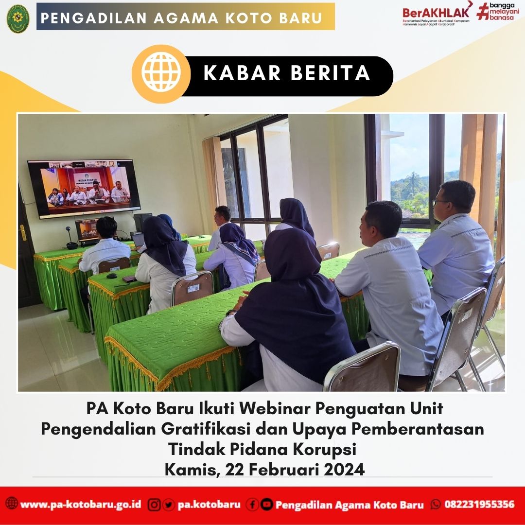 Bertempat di Media Center Pengadilan Agama Koto Baru, Ketua PA Koto Baru YM. Dr. Martina Lofa, S.HI, M.HI. didampingi Hakim, Panitera, Sekretaris serta Jajaran Kepaniteraan dan Kesekretariatan mengikuti kegiatan Webinar Penguatan Unit Pengendalian Gratifikasi dan Upaya Pemberantasan Tindak Pidana Korupsi yang diselenggarakan oleh Direktur Jenderal Badan Peradilan Agama Mahkamah Agung RI (Ditjen Badilag MA RI) secara daring.
