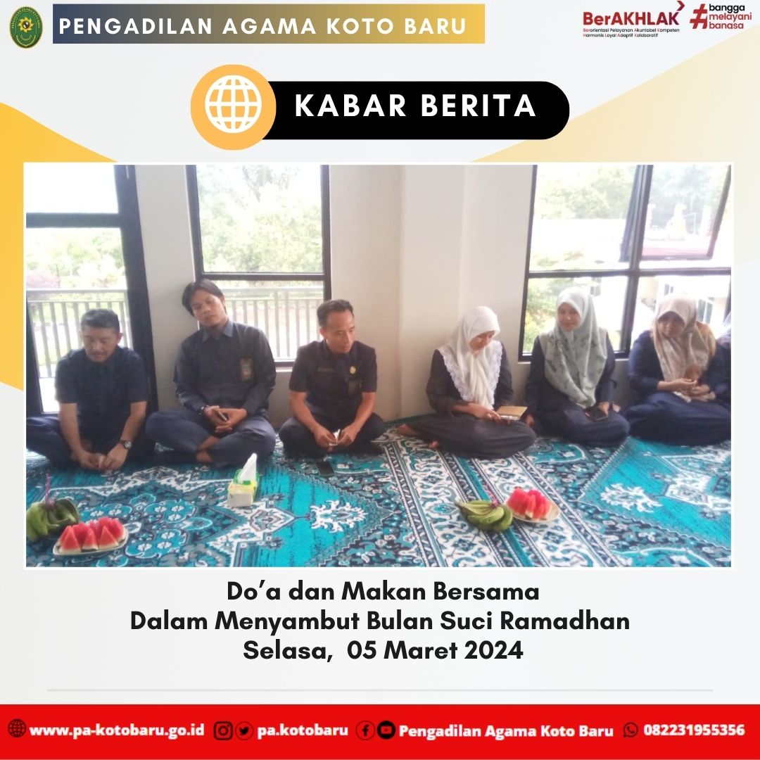 Senin, 05 Maret 2024, Keluarga besar Pengadilan Agama Koto Baru melaksanakan acara menyambut datangnya bulan suci Ramadhan 1445 H.  Acara yang dilaksanakan di Aula Pengadilan Agama Koto Baru dihadiri oleh seluruh Hakim, Pejabat, Pegawai dan PPNPN PA Koto Baru. Turut hadir juga dalam acara ini Mahasiswa Magang UIN Mahmud Yunus Batusangkar.