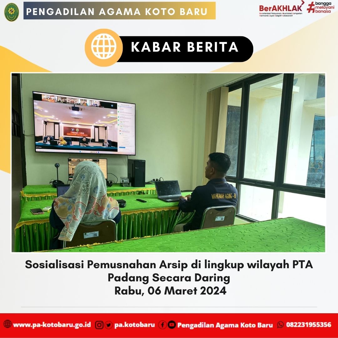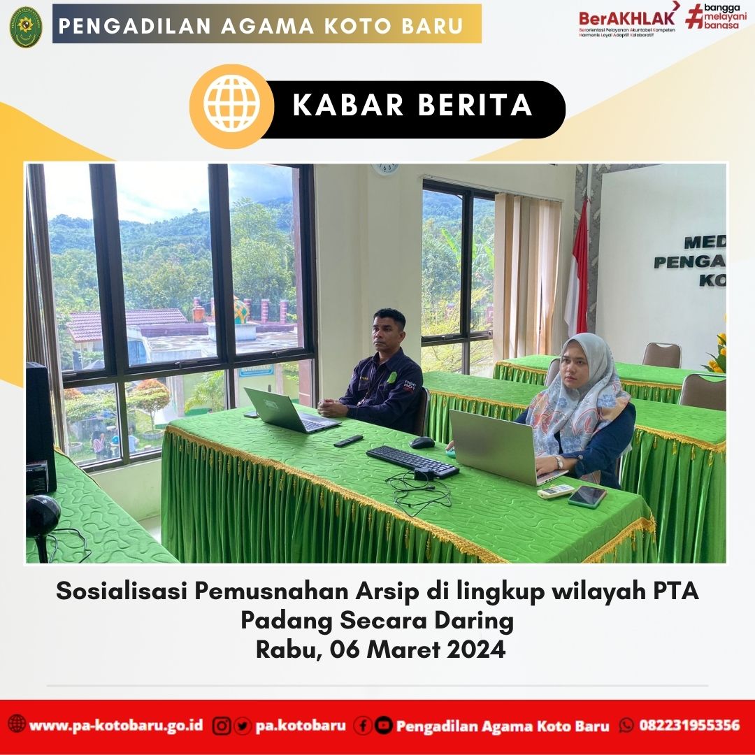Rabu, 06 Maret 2024, Bertempat di Ruang Media Center PA Koto Baru, Sekretaris (Fauzan Putra, S.Kom) dan Arsiparis (Lissa Putri Amirah, A.Md.A.B) mengikuti Sosialisasi Pemusnahan Arsip di lingkup wilayah Pengadilan Tinggi Agama Padang secara daring melalui aplikasi Zoom Meeting. Kegiatan ini dipimpin langsung oleh Plt. Sekretaris PTA Padang. Bertindak selaku Moderator yaitu Kasubbag Tata Usaha dan Rumah Tangga PTA Padang, Fungsional Arisparis Terampil PTA Padang sebagai Narasumber dan Fungsional Arsiparis Ahli Pertama PTA Padang sebagai Notulen.  Serta Kegiatan ini juga diikuti oleh Sekretaris, Kepala Sub Bagian dan Arsiparis Pengadilan Agama se-Sumatera Barat. Sosialisasi ini dilaksanakan berdasarkan Peraturan Kepala Arsip Nasional Republik Indonesia Nomor 37 Tahun 2016 tentang Pedoman Penyusutan Arsip. Dalam penjelasannya, Plt. Sekretaris menyampaikan bahwa pemusnahan arsip berkas perkara belum bisa dilakukan dan menunggu instruksi selanjutnya dari Mahkamah Agung sesuai Surat Panitera Mahkamah Agung Nomor 897/PAN/HK.05/05/2023 tanggal 04 mei 2023.