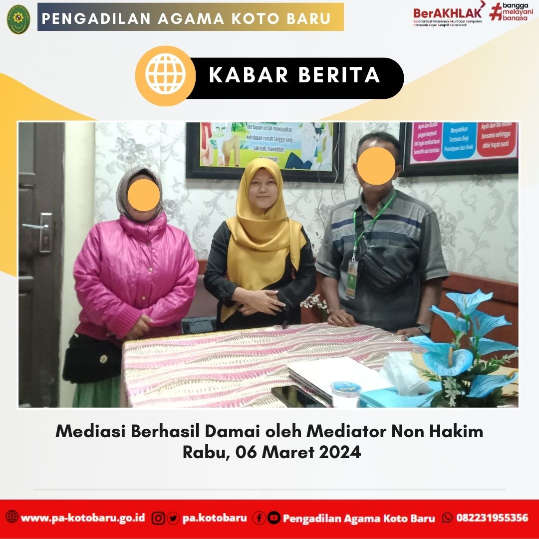 Rabu, 06 Maret 2024. Alhamdulillah Mediasi Berhasil Dengan Damai kembali dalam perkara Cerai Talak dengan Nomor: 102/Pdt.G/2024/PA.KBr, yang dilaksanakan di Ruang Mediasi Pengadilan Agama Koto Baru dengan dibantu oleh Mediator Non-Hakim Ibu Lusi Tania Agustin, S.Sos.I., M.Psi., CPM. semoga kiranya membawa berkah buat Para Pihak. Di tempat mediasi inilah untuk kesekian kalinya pasangan yang hendak bercerai berhasil didamaikan. Pada hari ini yang bertindak sebagai mediator non-hakim adalah Ibu Lusi Tania Agustin, S.Sos.I., M.Psi., CPM.