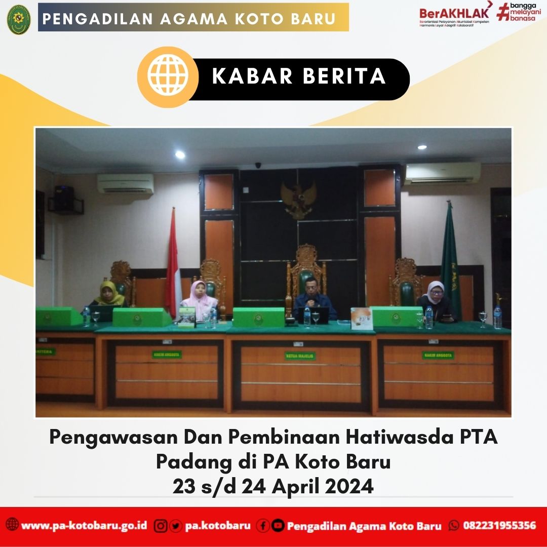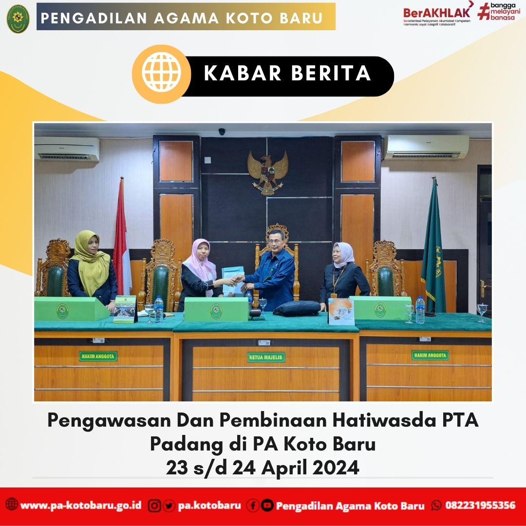 Bertempat di Pengadilan Agama Koto Baru dilakukan kegiatan Pembinaan dan Pengawasan yang dilakukan oleh Tim Hatiwasda dipimpin oleh Drs. H. Syafri Amrul M.H.I. (Hakim Tinggi PTA Padang) didampingi oleh Elvi Yunita S.H., M.H. (Kasubbag Rencana Program dan Anggaran) dan Hj. Alifah S.H. (Panitera Pengganti PTA Padang) berdasarkan Surat Tugas Nomor: 1278/KPTA.W3-A/PW1.1/IV/2024 yang dilaksanakan selama 2 hari, mulai 23 s/d 24 April 2024.