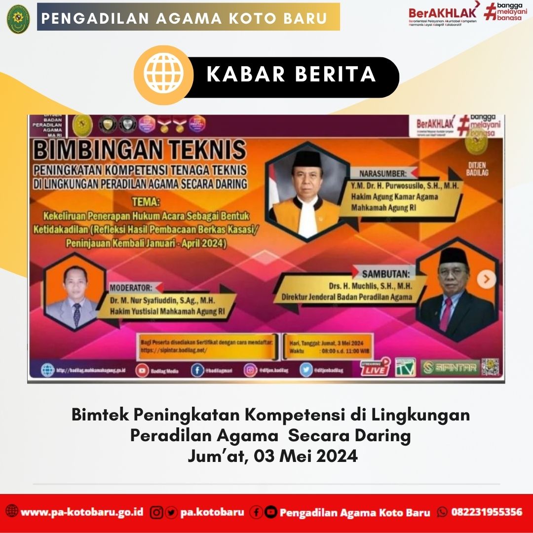 Bimbingan teknis ini diadakan dalam rangka meningkatkan kualitas dan kapasitas tenaga teknis di lingkungan peradilan agama dalam permasalahan teknis yustisial, dengan tema “Kekeliruan Penerapan Hukum Acara Sebagai Bentuk Ketidakadilan (Refleksi Hasil Pembacaan Berkas Kasasi/Peninjauan Kembali Januari-April 2024)”, sebagai narasumber Yang Mulia Hakim Agung Kamar Agama Mahkamah Agung Republik Indonesia, Bapak Dr. H. Purwosusilo, S.H., M.H.