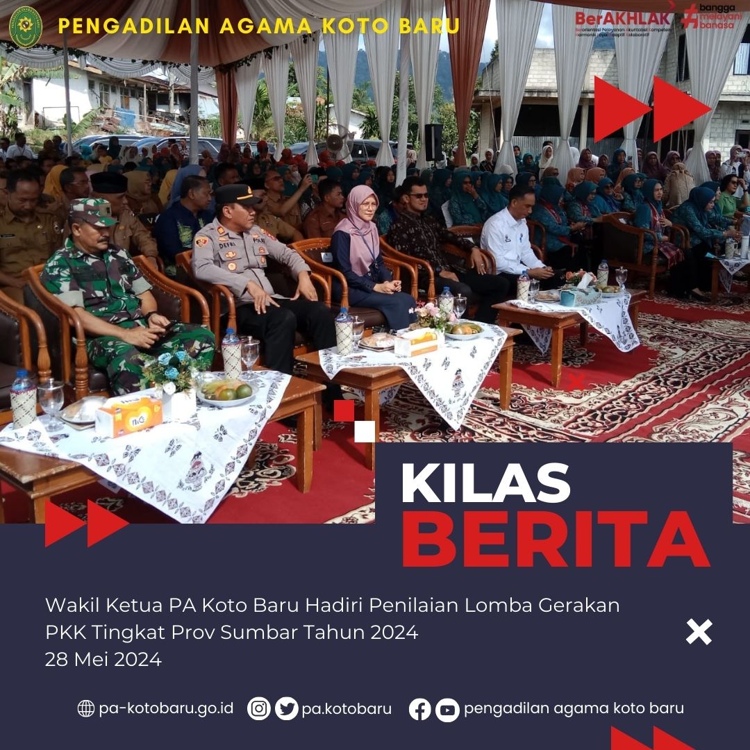 Wakil Ketua Pengadilan Agama Koto Baru YM Nidaul Husni, S.HI, M.H. menghadiri Penilaian Lomba Gerakan PKK Tingkat Provinsi Sumatera Barat Tahun 2024. Kegiatan ini dilaksanakan di Nagari Koto Gaek Guguak Kecamatan Gunung Talang Kab. Solok, Selasa (28/05/2024). Turut Hadir dalam kegiatan ini yaitu Ketua Tim Penggerak PKK Kab. Solok dan Forkompimda Kab Solok serta pada undangan