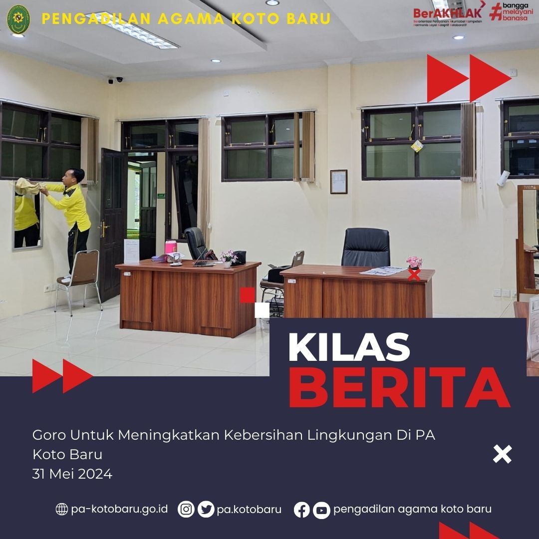 Kegiatan bersih-bersih ini merupakan sebuah komitmen untuk menciptakan nuansa yang sejuk, nyaman dan bersih. Adapun kegiatan yang dilakukan antara lain membersihkan lingkungan kantor dan halaman kantor PA Koto Baru. Kegiatan bersih- bersih ini diharapkan bisa menjadi sarana untuk menumbuhkan rasa kebersamaan, menjaga kekompakan dan kekeluargaan serta dapat menciptakan keindahan dilingkungan Pengadilan Agama Koto Baru sehingga masyarakat pencari keadilan yang datang ke PA Koto Baru menjadi nyaman.