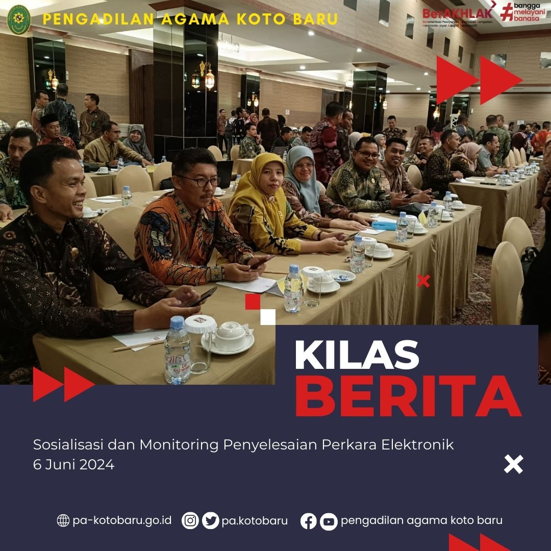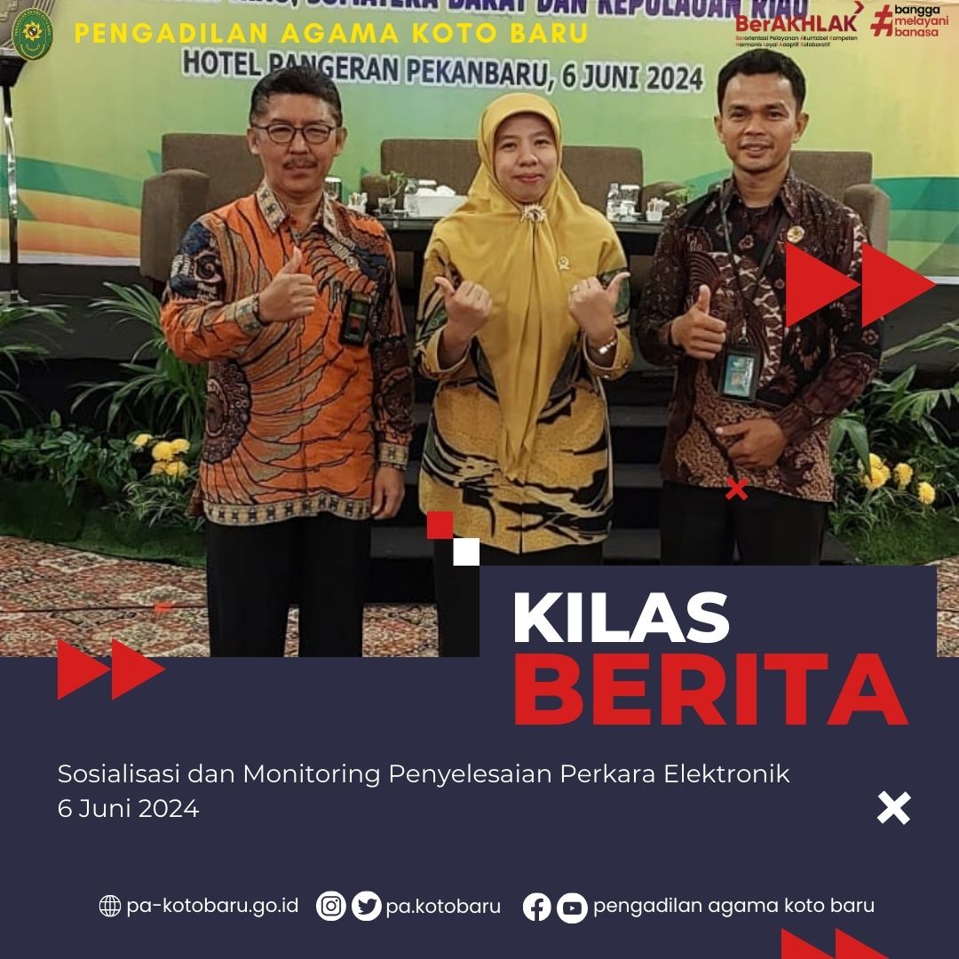 Sehubungan dengan surat Panitera Mahkamah Agung RI Nomor 889/PAN/OT.01.2/5/2024 tanggal 30 Mei 2024 perihal Sosialisasi dan Monitoring Penyelesaian Perkara Elektronik, maka Pengadilan Agama Koto Baru mengikuti kegiatan sosialisasi tersebut. Kegiatan ini di ikuti oleh Dr. Martina Lofa, SHI, M.HI (Ketua PA Koto Baru), Fahmi, S, S.H (Panitera PA Koto Baru) dan Yama Hendra, S.HI. Sosialisasi ini diselenggarakan di Hotel Pangeran Pekanbaru, Kamis (06/06/2024)