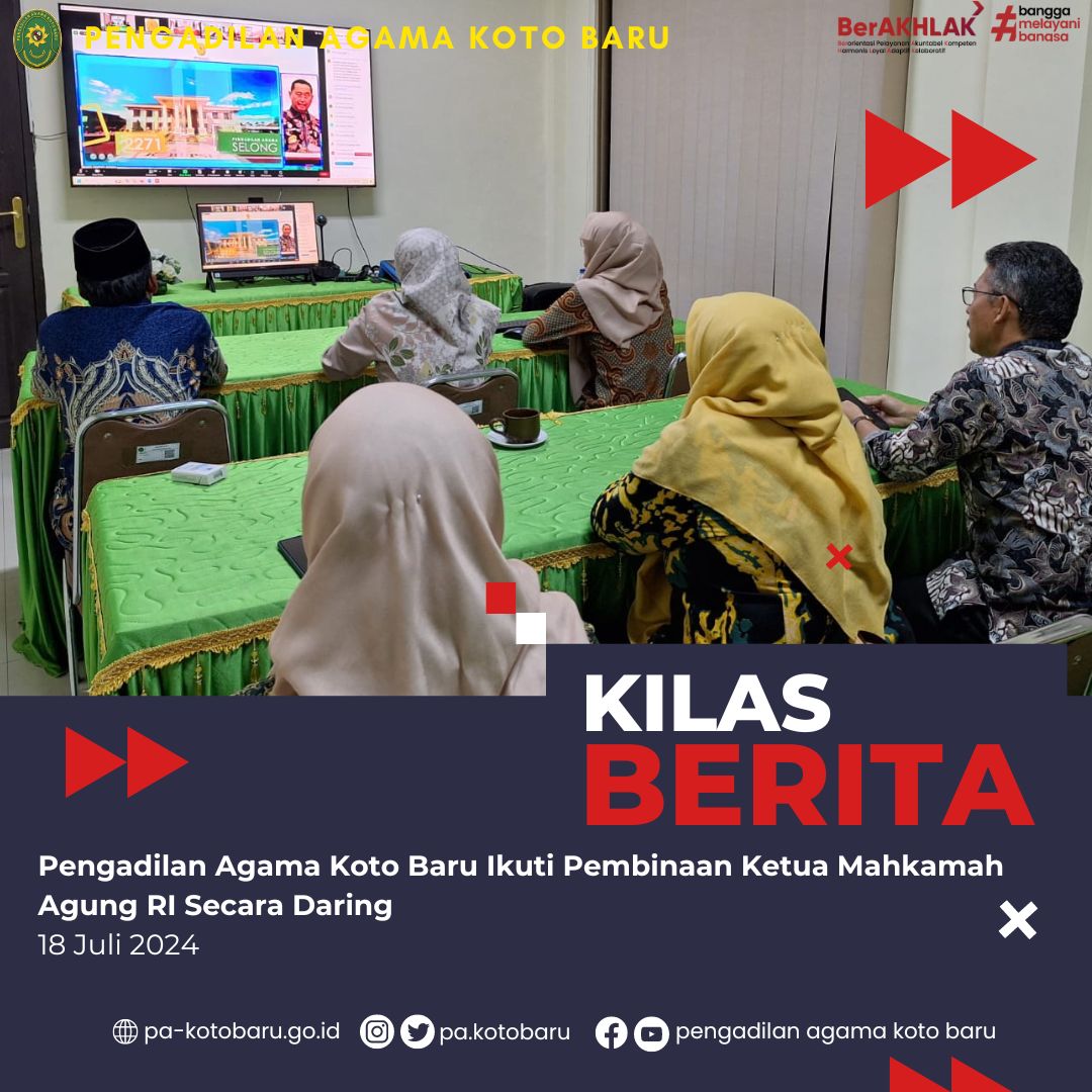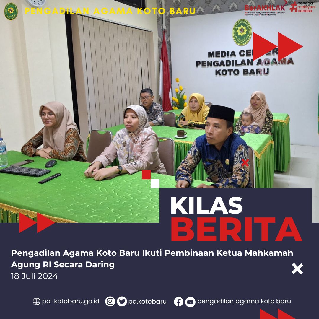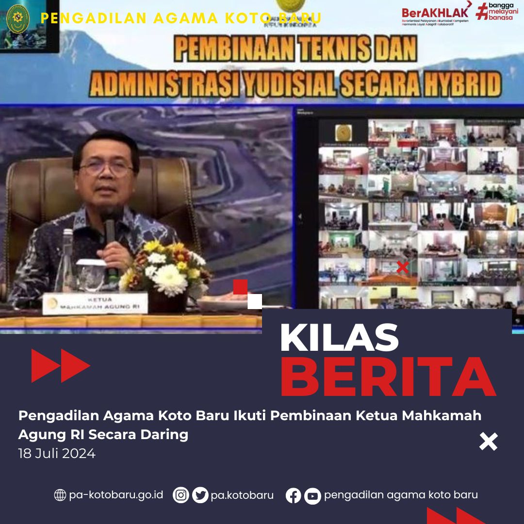 Pada Hari Kamis, 18 Juli 2024, Pengadilan Agama Koto Baru mengikuti Pembinaan Teknis dan Administrasi Yudisial oleh Pimpinan Mahkamah Agung RI untuk jajaran Empat Lingkungan Peradilan Seluruh Indonesia yang diselenggarakan secara hybrid dengan tatap muka (offline) di Prime Park Hotel dan Convetion Lombok, Mataram, Nusa Tenggara Barat dan secara virtual melalui zoom meeting di Ruang Media Center Pengadilan Agama Koto Baru.