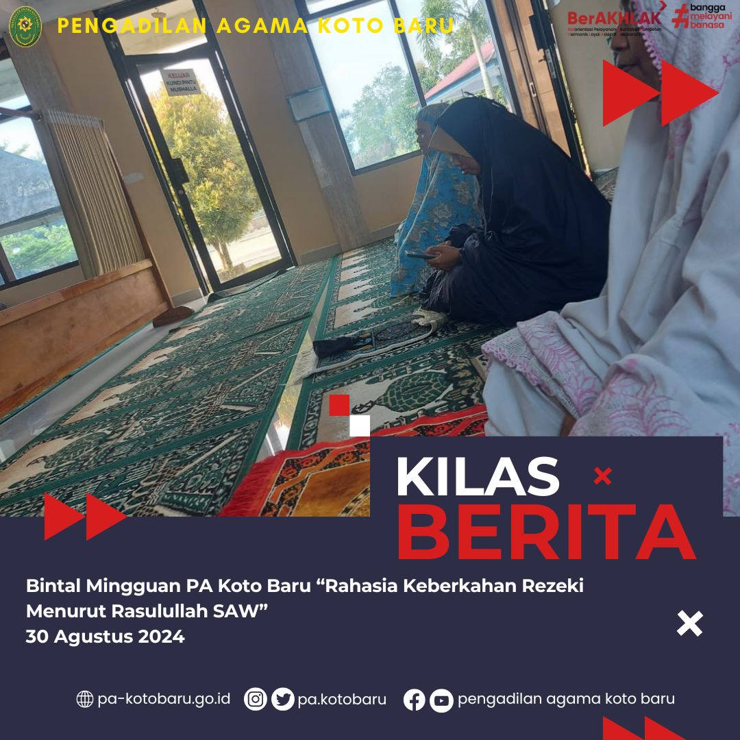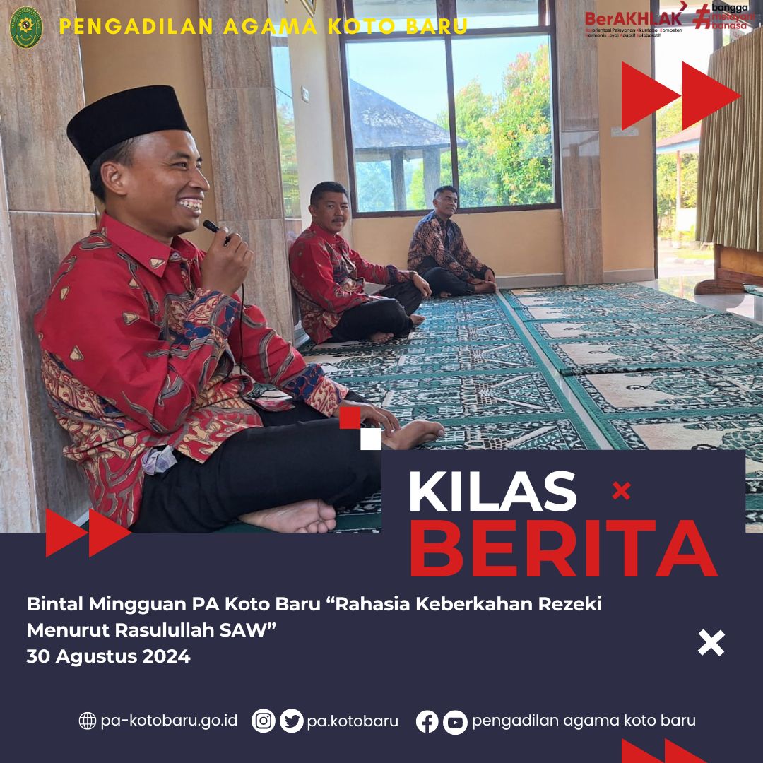 Tepat selepas sholat Ashar berjama’ah pada hari Jum'at, 30 Agustus 2024 di Musholla PA Koto Baru, dilaksanakan Bintal (Bina Mental) Mingguan yang diikuti oleh seluruh warga PA Koto Baru. Bertindak sebagai penceramah bintal Mingguan ini yaitu Syaiful Amin S.HI, M.HI (Hakim PA Koto Baru). Beliau membawakan materi Bintal dengan topik “Rahasia Keberkahan Rezeki Menurut Rasulullah SAW”.