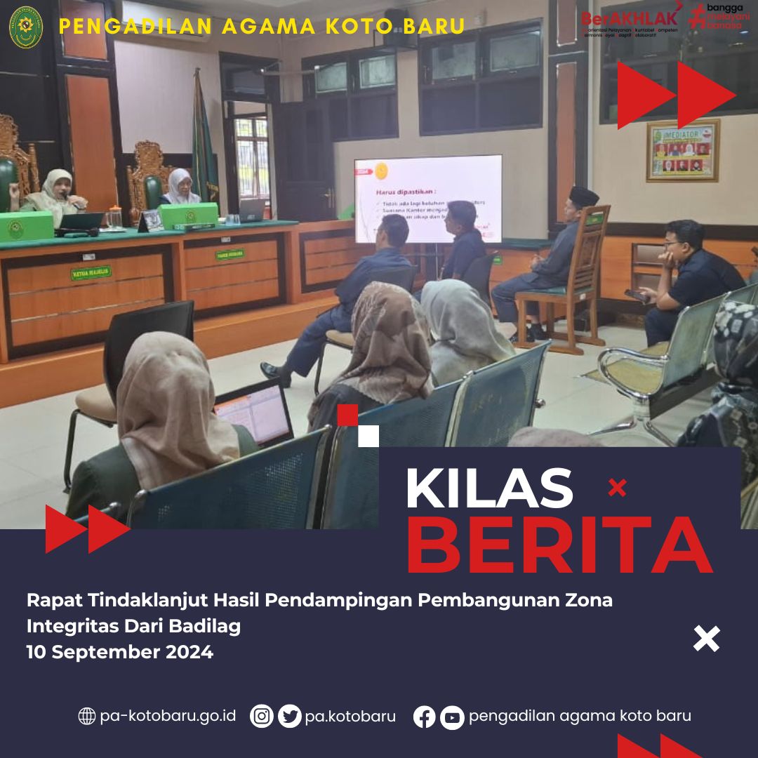 Selasa, 10 September 2024 - Pengadilan Agama Koto Baru mengadakan Rapat Tindaklanjut Hasil Pendampingan Pembangunan Zona Integritas Dari Dirjen Badilag. Rapat ini dipimpin oleh Dr. Martina Lofa, S.HI, M.HI selaku Ketua PA Koto Baru dan Nidaul Husni, S.HI, M.H selaku Ketua Zona Integritas. Rapat membahas tentang tindak lanjut hasil pendampingan pembangunan Zona Integritas dari Dirjen Badilag pada tanggal 10 September 2024.
