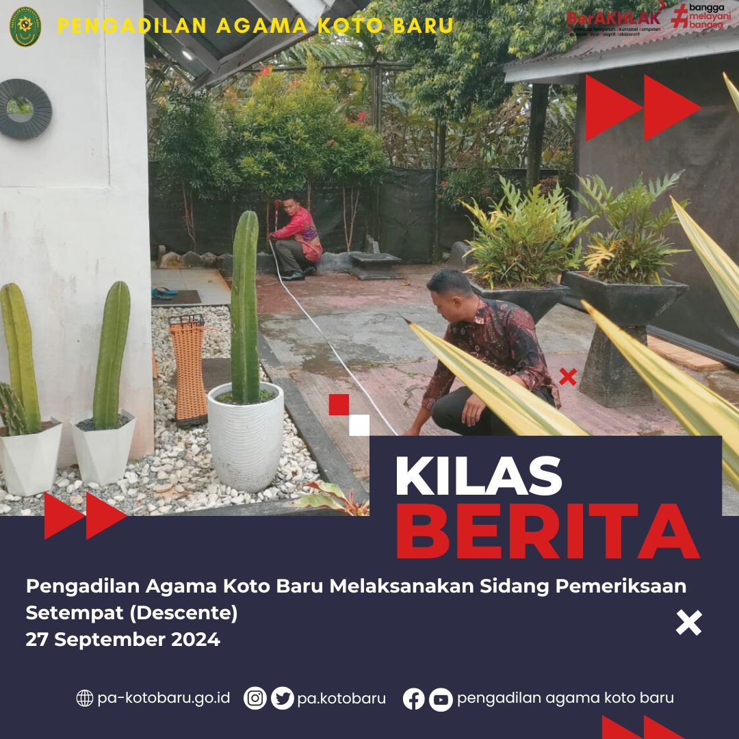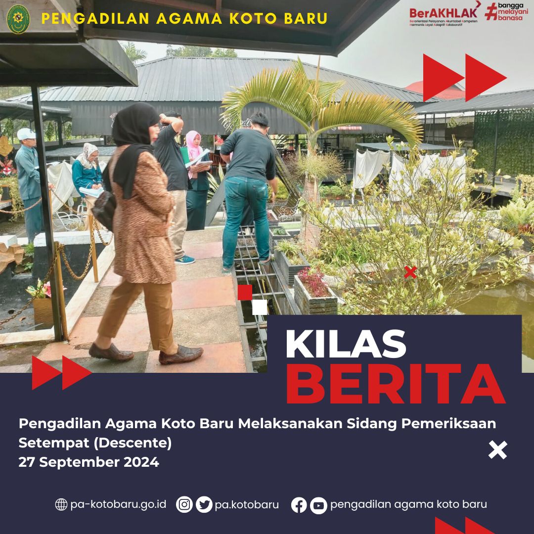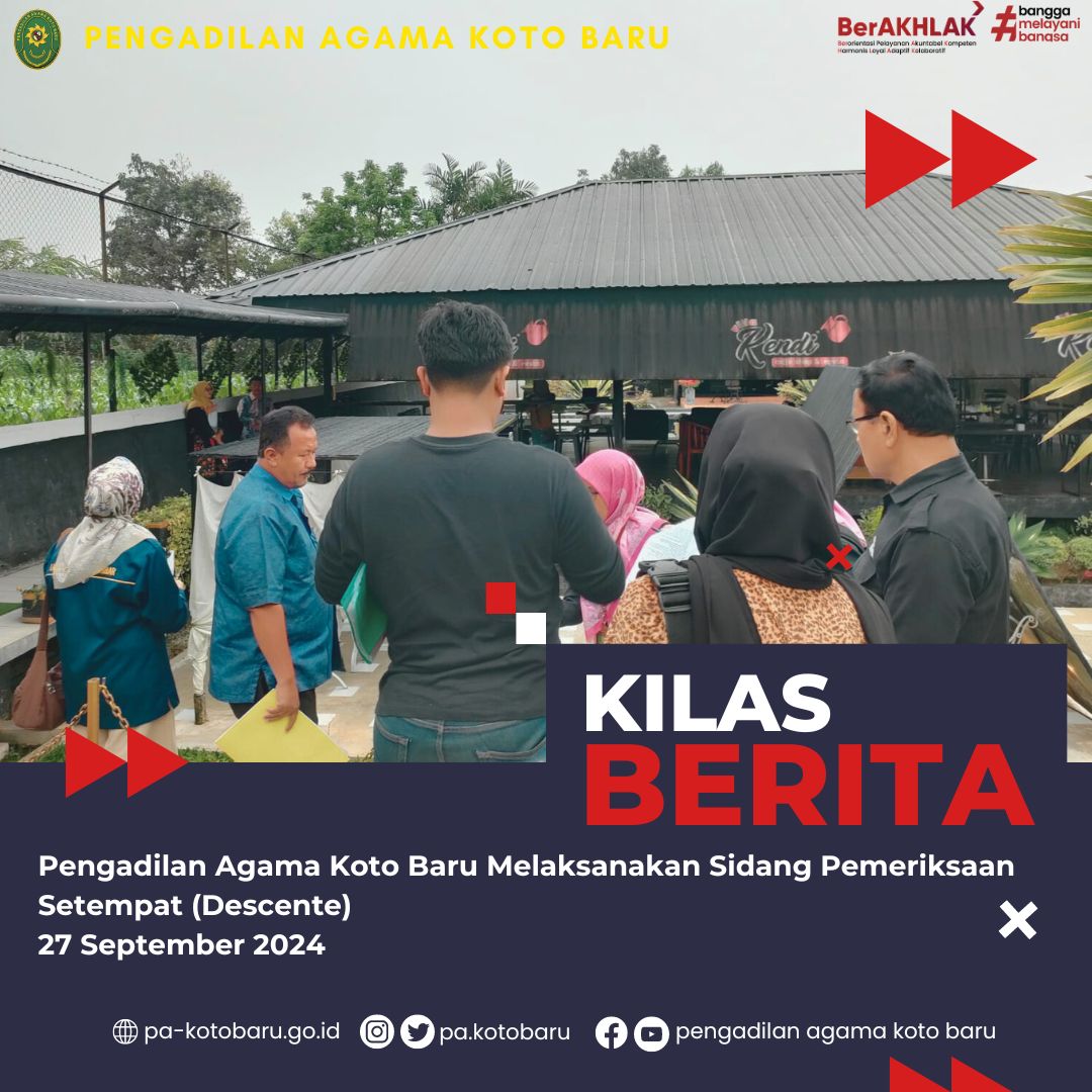 Koto Baru, Jumat tanggal 27 September 2024, Pengadilan Agama Koto Baru melaksanakan Sidang Pemeriksaan Setempat (descente) atau Sidang Lapangan atas perkara Gugatan Harta Bersama dari Pengadilan Agama Padang dengan Nomor : 459/Pdt.G/2024/PA.Pdg. Pelaksanaan sidang pemeriksaan setempat dilakukan oleh Majelis Hakim PA Koto Baru.