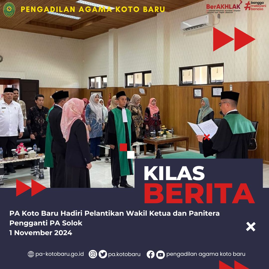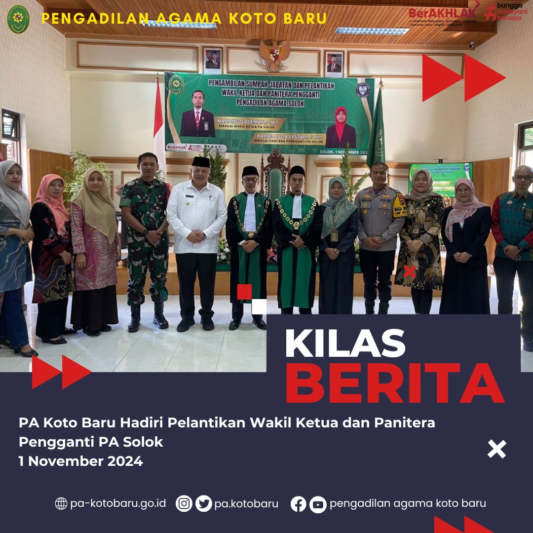 Jum’at, 01/11/2024 - Ketua Pengadilan Agama Koto Baru Dr. Martina Lofa, S.HI, M.HI menghadiri Acara Pengambilan Sumpah dan Pelantikan Wakil Ketua Nanang Soleman, S.HI dan Panitera Pengganti PA Solok Rahmi Aulia Lestari, S.HI di Ruang Serba Guna Pengadilan Agama Solok. Selain itu, Wakil Ketua PA Koto Baru Nidaul Husni, S.HI, M.H diminta sebagai Saksi pada acara pelantikan tersebut
