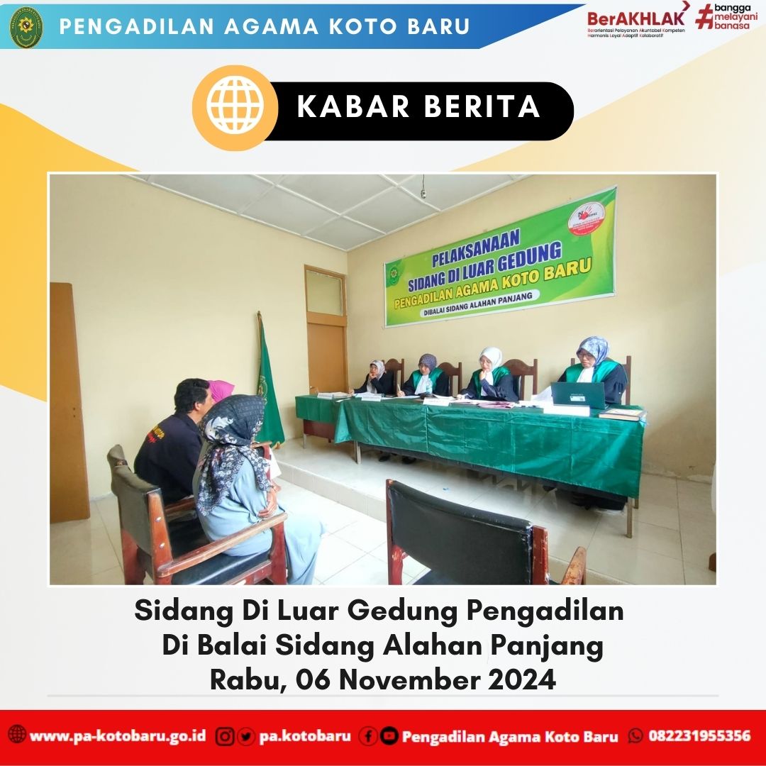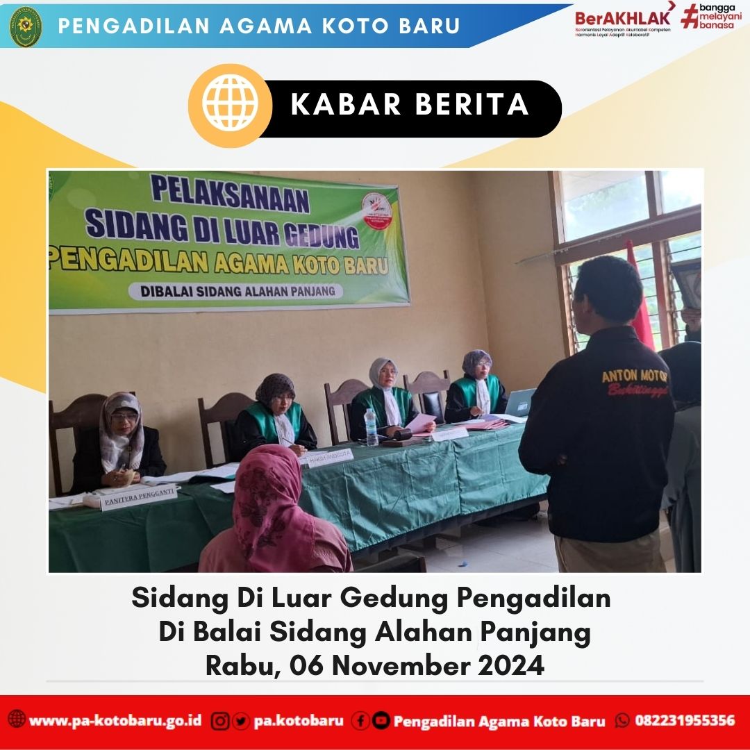 Rabu, 06 November 2024 Pengadilan Agama Koto Baru kembali melaksanakan sidang keliling yang diselenggarakan di Balai Sidang Alahan Panjang. Sidang keliling kali ini terdiri dari 1 (satu) Majelis Hakim yang diketuai oleh Nidaul Husni, S.HI, M.H didampingi Hakim anggota yaitu Azimar Syamsi, S.HI dan Asmellia, S.HI serta didampingi Panitera Pengganti Hj. Refti Desfita, S.Ag. S.H. serta 1 Jurusita Pengganti, 1 Petugas PTSP, 1 Petugas Administrator