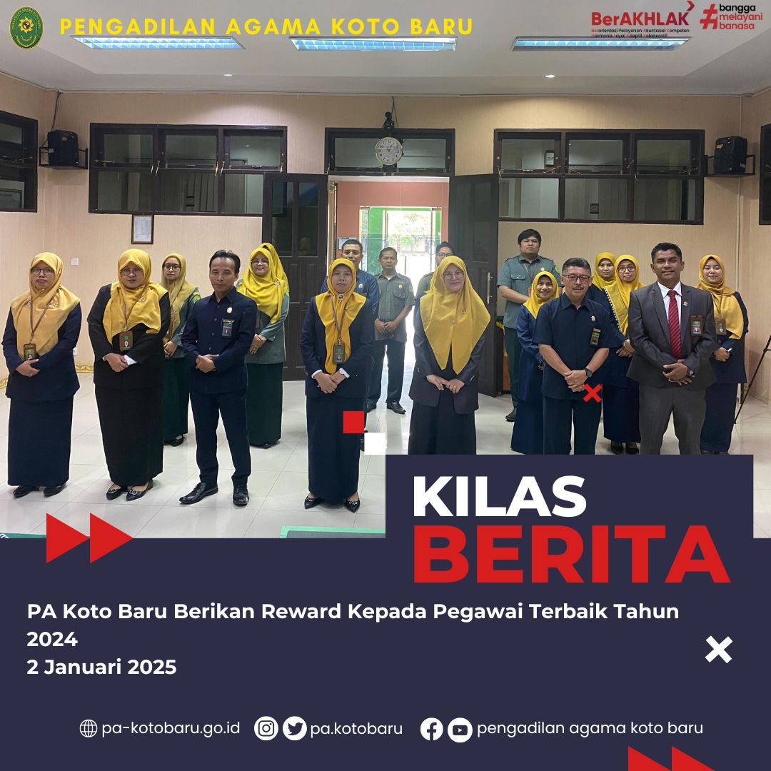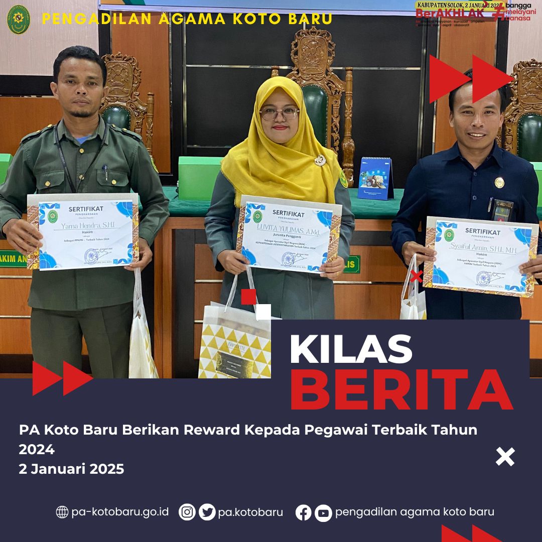 Sebagai bentuk apresiasi atas kinerja yang telah dilakukan pegawainya, Setelah Pelaksanaan Apel Pagi, Pengadilan Agama Koto Baru berikan Penghargaan (reward) Kepada Pegawai Terbaik 2024. Kamis, (2/1/2025), Kegiatan tersebut dipimpin oleh Ketua PA Koto Baru, Dr. Martina Lofa, S.HI, MHI dan diikuti oleh Wakil Ketua, Hakim, Panitera dan Sekretaris, Pejabat Struktural dan Fungsional serta PPNPN Pengadilan Agama Koto Baru.