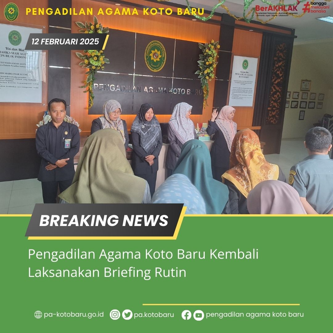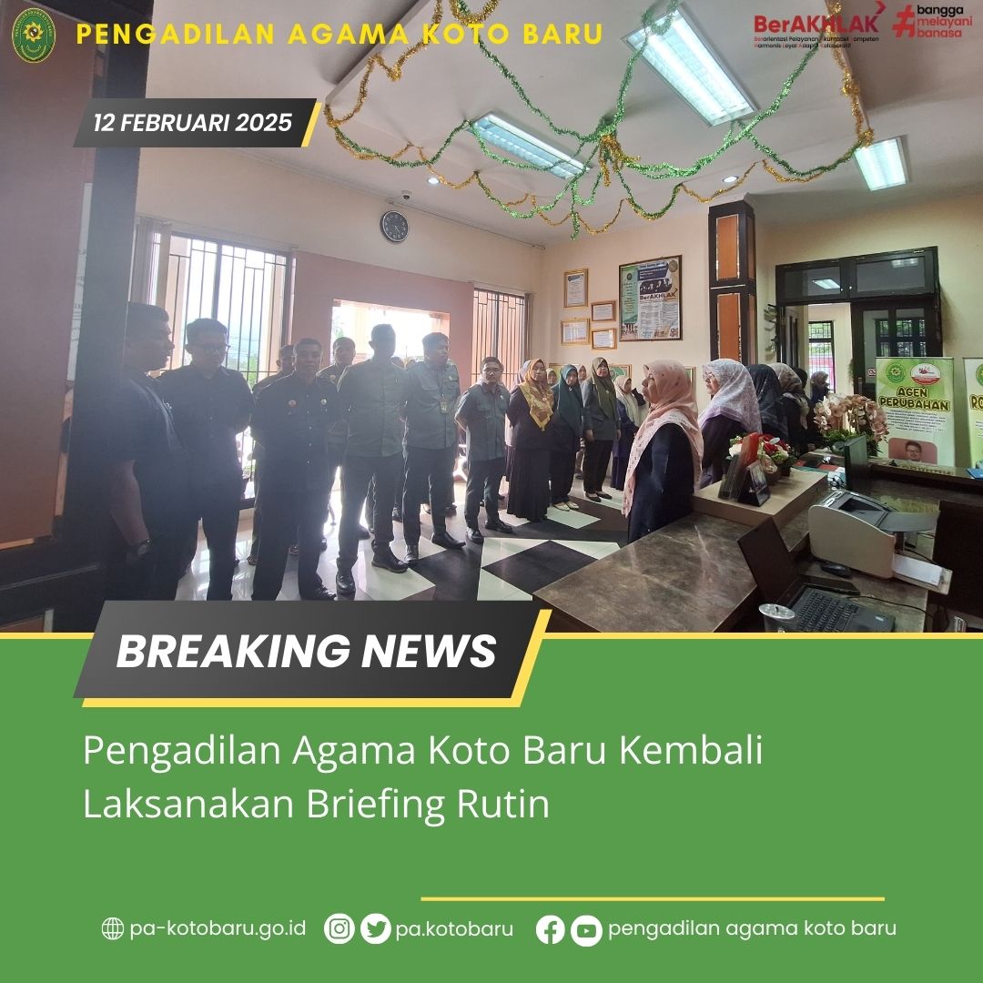 Koto Baru, 12 Februari 2025 – Pengadilan Agama Koto Baru kembali menggelar briefing rutin untuk meningkatkan kinerja dan profesionalisme seluruh hakim dan pegawai. Briefing yang berlangsung pada hari ini dihadiri oleh Seluruh Hakim dan Pegawai Pengadilan Agama Koto Baru. Briefing ini dilaksanakan di Ruang Resepsionis PA Koto Baru.