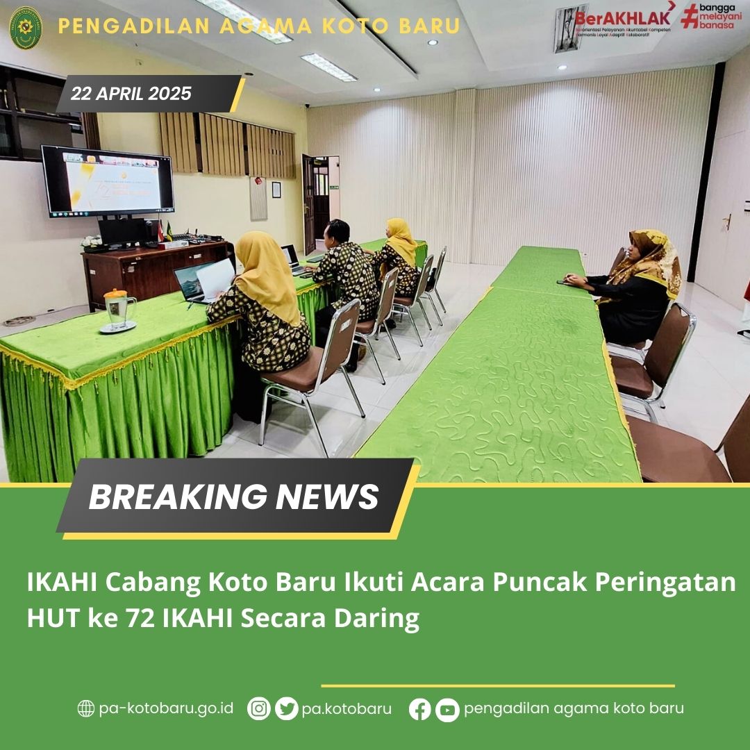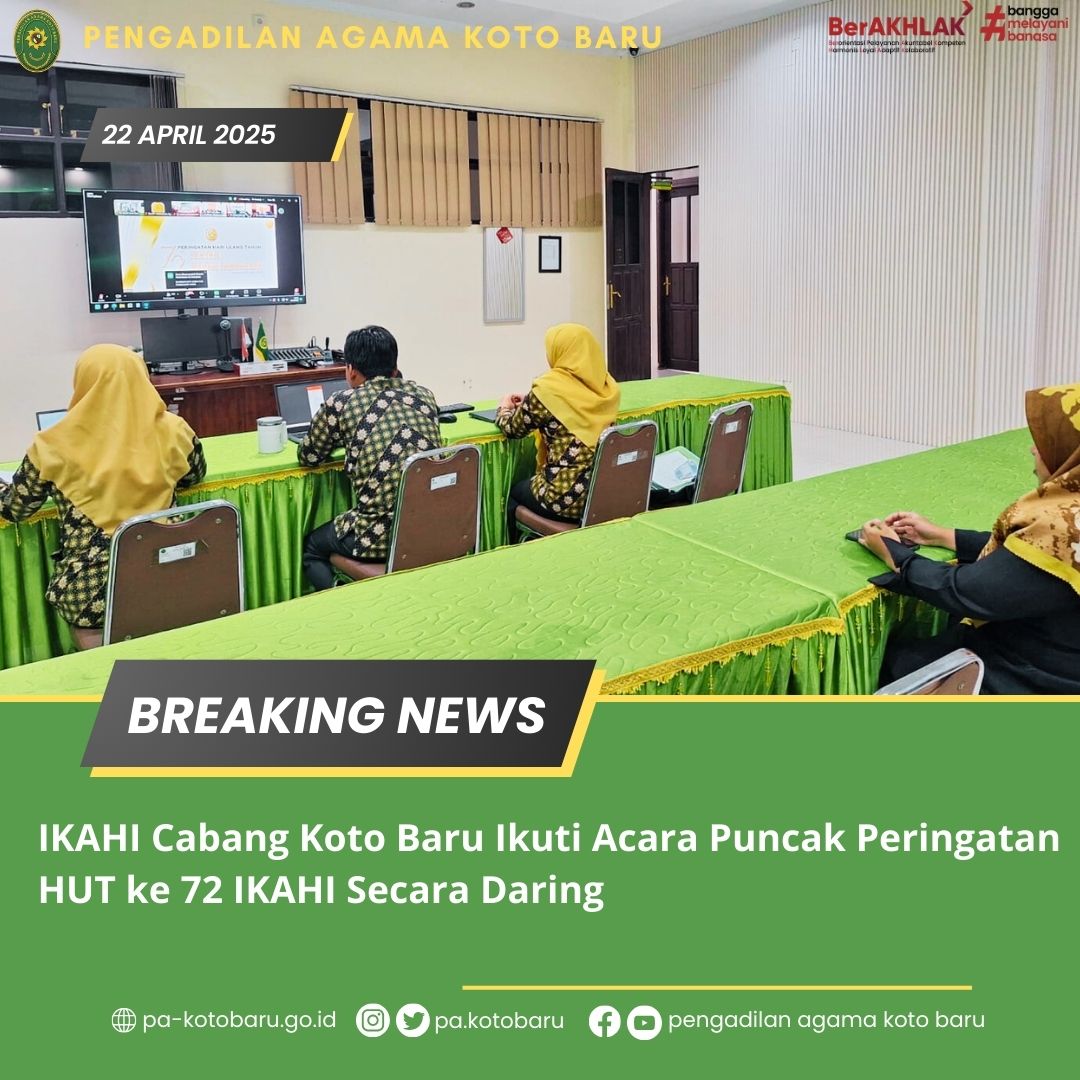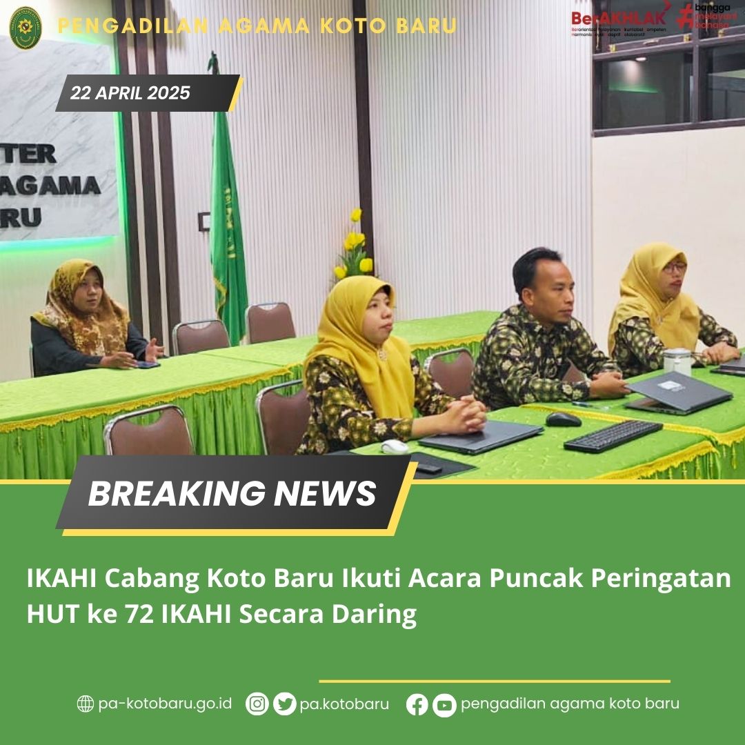 Koto Baru, 23 April 2025 – Ikatan Hakim Indonesia (IKAHI) Cabang Koto Baru yang terdiri dari Ketua Dr. Martina Lofa, S.HI, M.HI beserta Hakim pada Pengadilan Agama Koto Baru mengikuti Acara Puncak Peringatan HUT ke 72 IKAHI melalui zoom meeting di Ruang Media Center Pengadilan Agama Koto Baru.