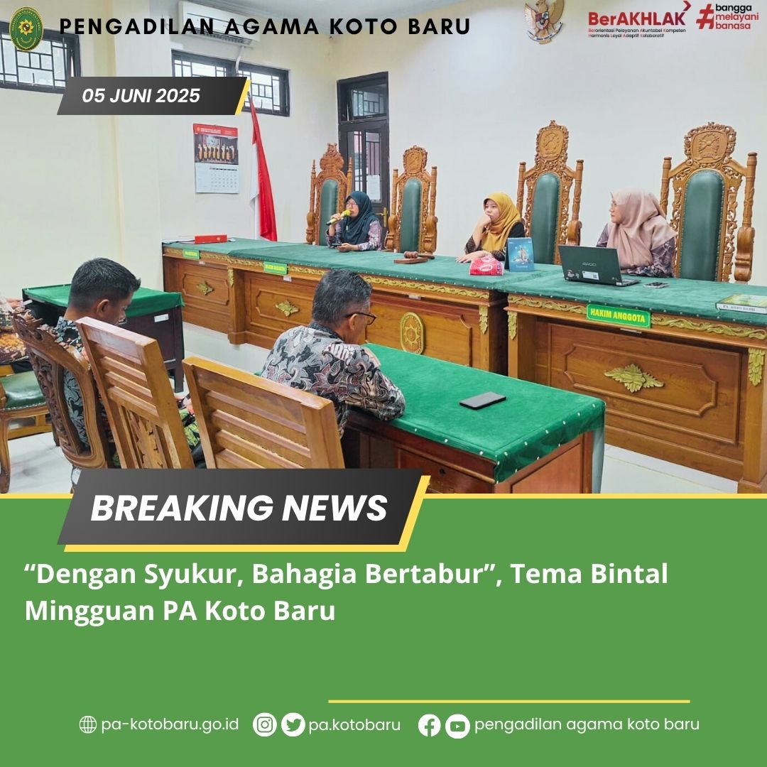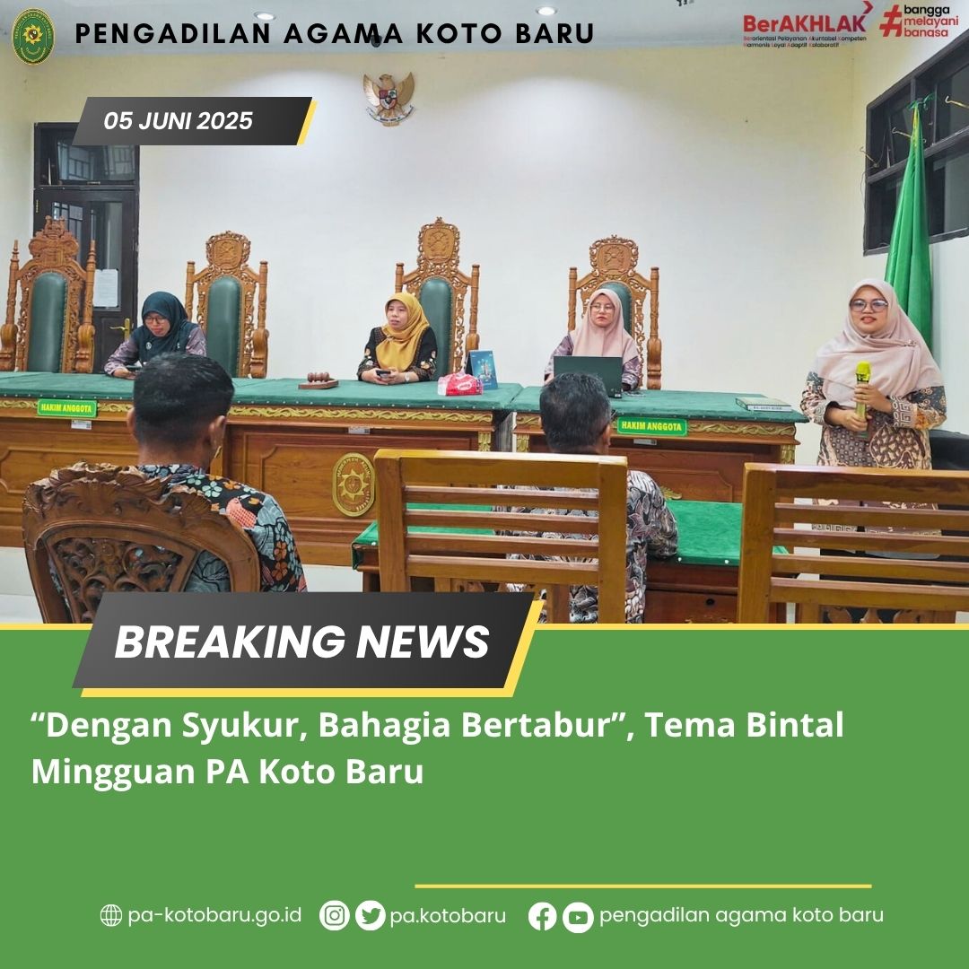 Bertempat di Ruang Sidang Pengadilan Agama Koto Baru, Kamis, 05 Juni 2025, kembali dilaksanakan Bintal (Bina Mental) Mingguan yang diikuti oleh seluruh warga PA Koto Baru. Bertindak sebagai penceramah bintal Mingguan ini yaitu Azimar Syamsi, S.HI, M.H (Hakim PA Koto Baru). Beliau membawakan materi Bintal dengan topik “Dengan Syukur, Bahagia Bertabur”.