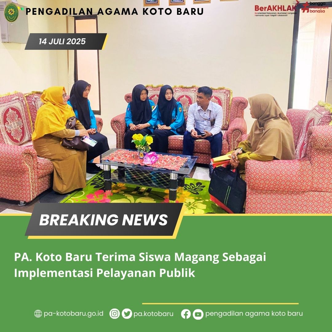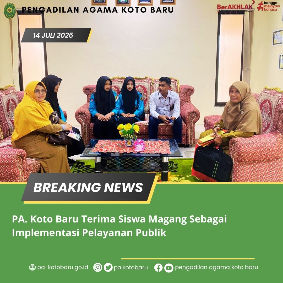 Pada Senin, 14 Juli 2025, Pengadilan Agama Koto Baru mengadakan acara penerimaan siswa magang dari SMK N 1 Solok. Bertempat di ruang tamu terbuka PA Koto Baru, Fauzan Putra, S.Kom, selaku Sekretaris, menerima 3 siswa yang akan menjalani magang atau praktik lapangan selama 3 bulan ke depan. Kegiatan ini merupakan langkah strategis pengadilan dalam meningkatkan pelayanan kepada publik sekaligus memberikan pengalaman berharga bagi siswa.