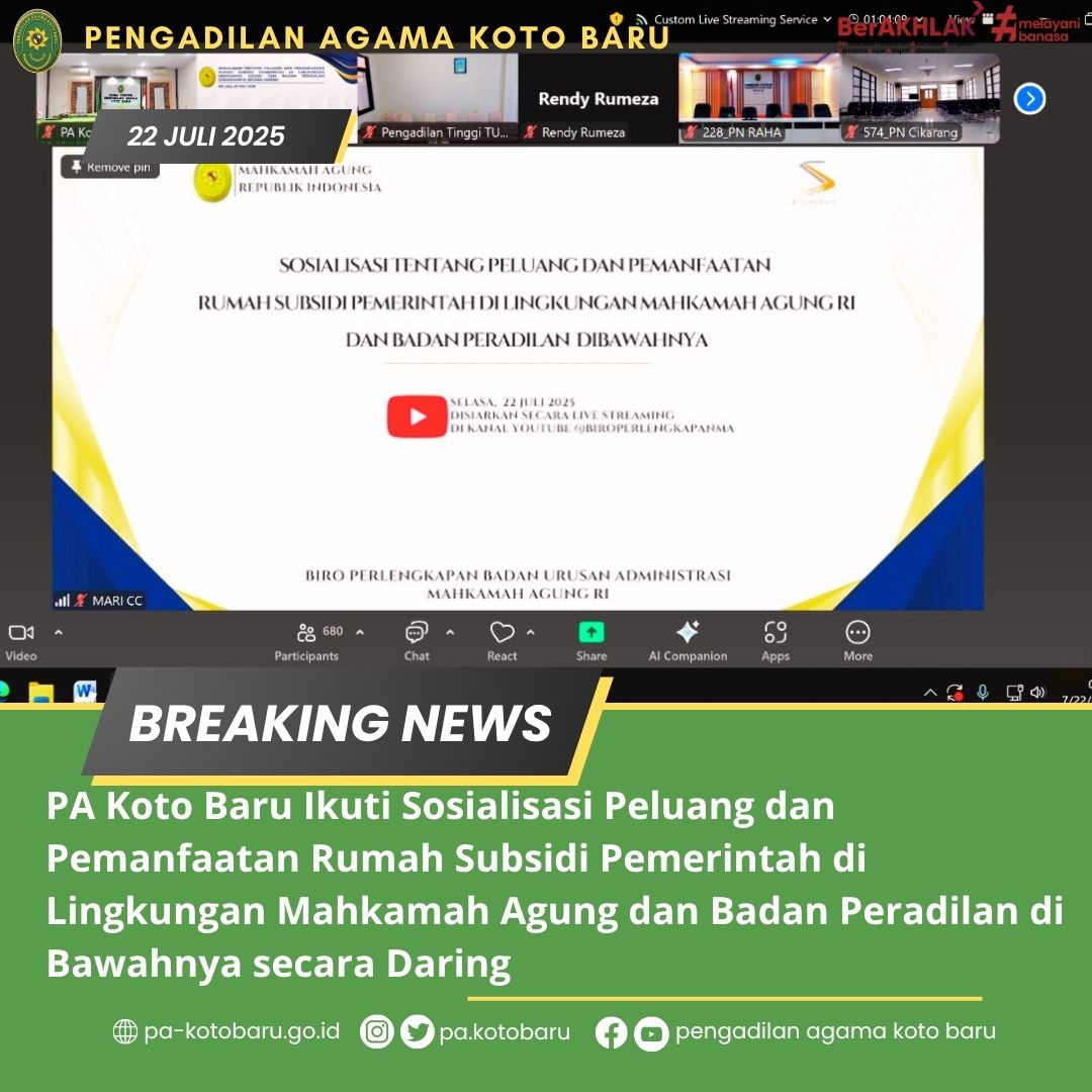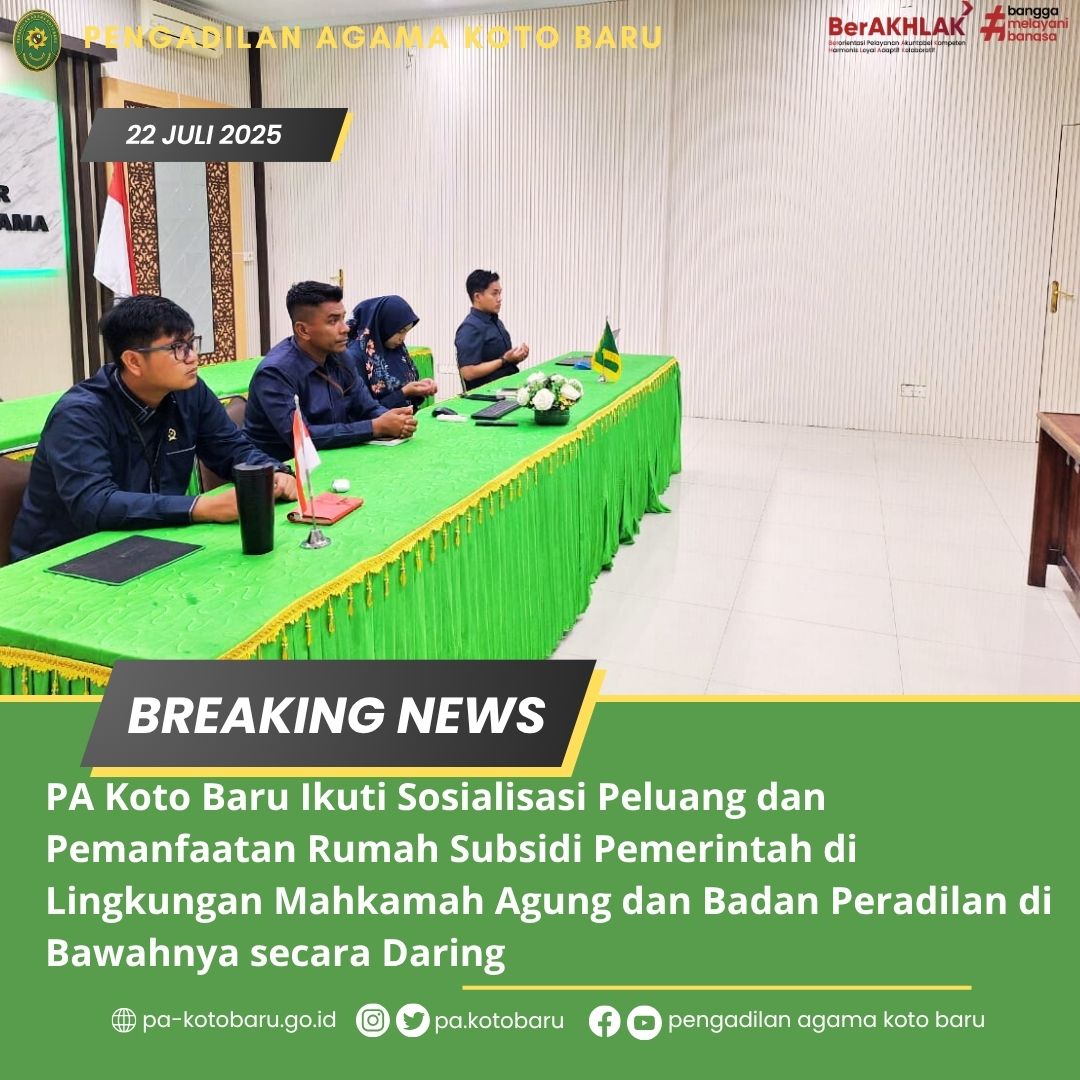 Selasa, 22 Juli 2025, Pengadilan Agama Koto Baru mengikuti kegiatan Sosialisasi Peluang dan Pemanfaatan Rumah Subsidi Pemerintah di Lingkungan Mahkamah Agung dan Badan Peradilan di Bawahnya secara daring. Kegiatan ini diikuti oleh Para Hakim dan Sekretaris Pengadilan Agama Koto Baru. Kegiatan dilaksanakan di Ruang Media Center Pengadilan Agama Koto Baru.