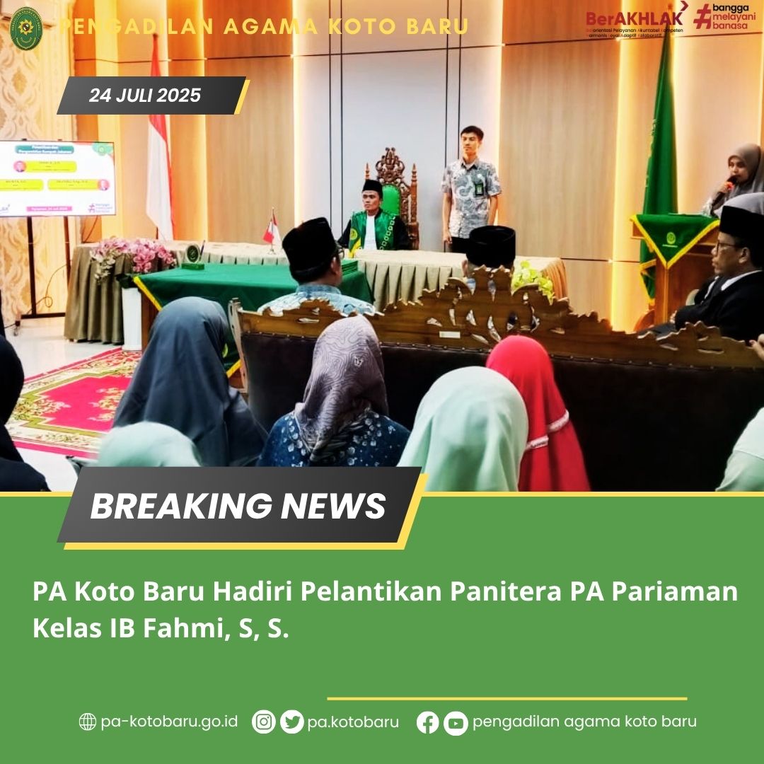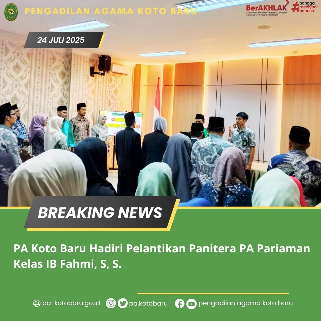 Kamis, 24/07/2025 - Ketua Pengadilan Agama Koto Baru YM. Nidaul Husni, SHI, M.H beserta Pegawai Pengadilan Agama Koto Baru menghadiri Acara Pengambilan Sumpah dan Pelantikan Fahmi, S, S.H. di Ruang Sidang Utama Pengadilan Agama Pariaman Kelas IB. Seperti yang diketahui, Rahma Deni Surya yang sebelumnya menjabat sebagai Panitera di Pengadilan Agama Koto Baru, kini telah dipromosikan dan dimutasi ke Pengadilan Agama Pariaman Kelas IB sebagai Panitera.