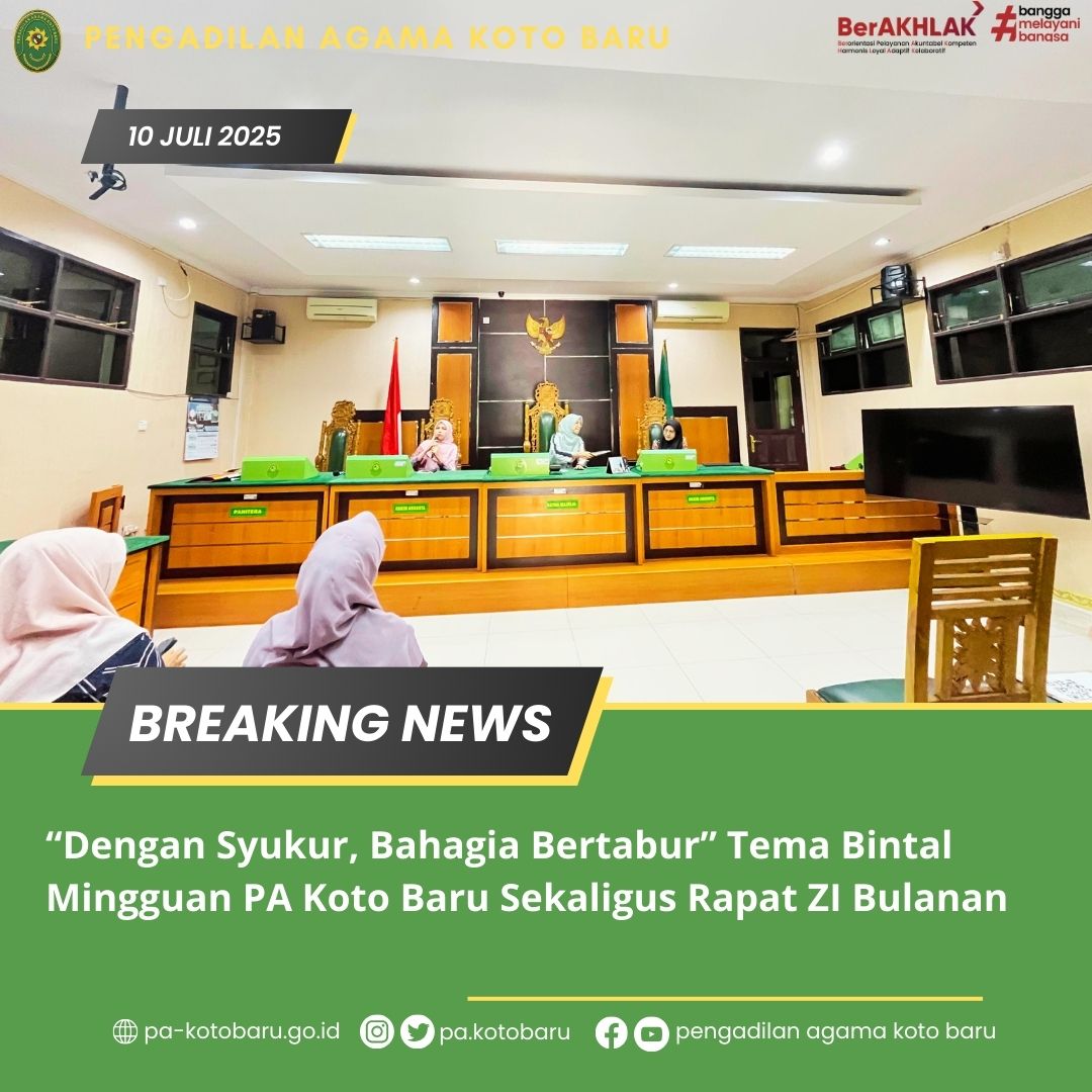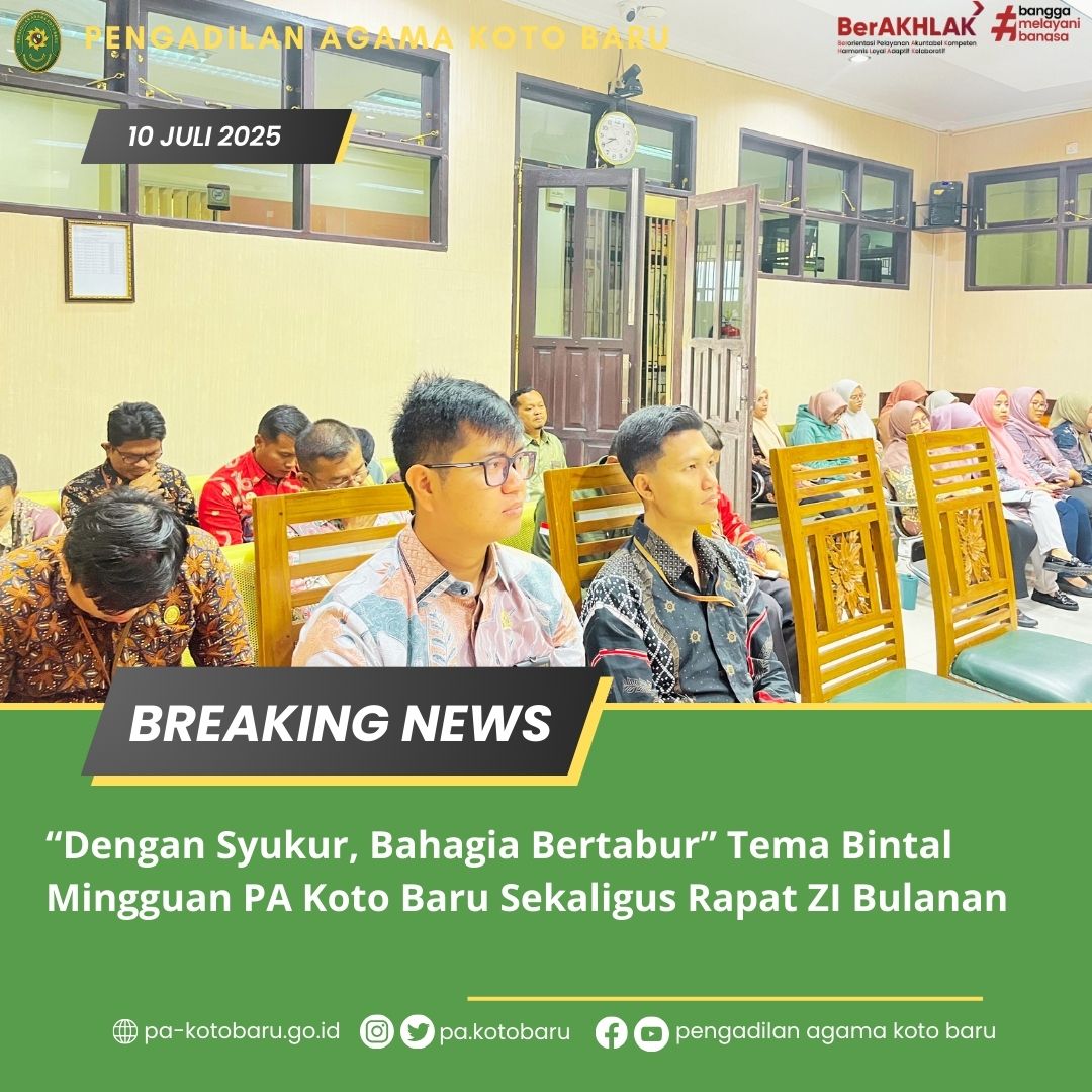 Bertempat di Ruang Sidang Pengadilan Agama Koto Baru, Kamis, 11 September 2025, kembali dilaksanakan Bintal (Bina Mental) Mingguan yang diikuti oleh seluruh warga PA Koto Baru. Bertindak sebagai penceramah bintal Mingguan yaitu YM. Widiya Yusmar, S.H. (Hakim PA Koto Baru). Beliau membawakan materi Bintal “Dengan Syukur, Bahagia Bertabur”.